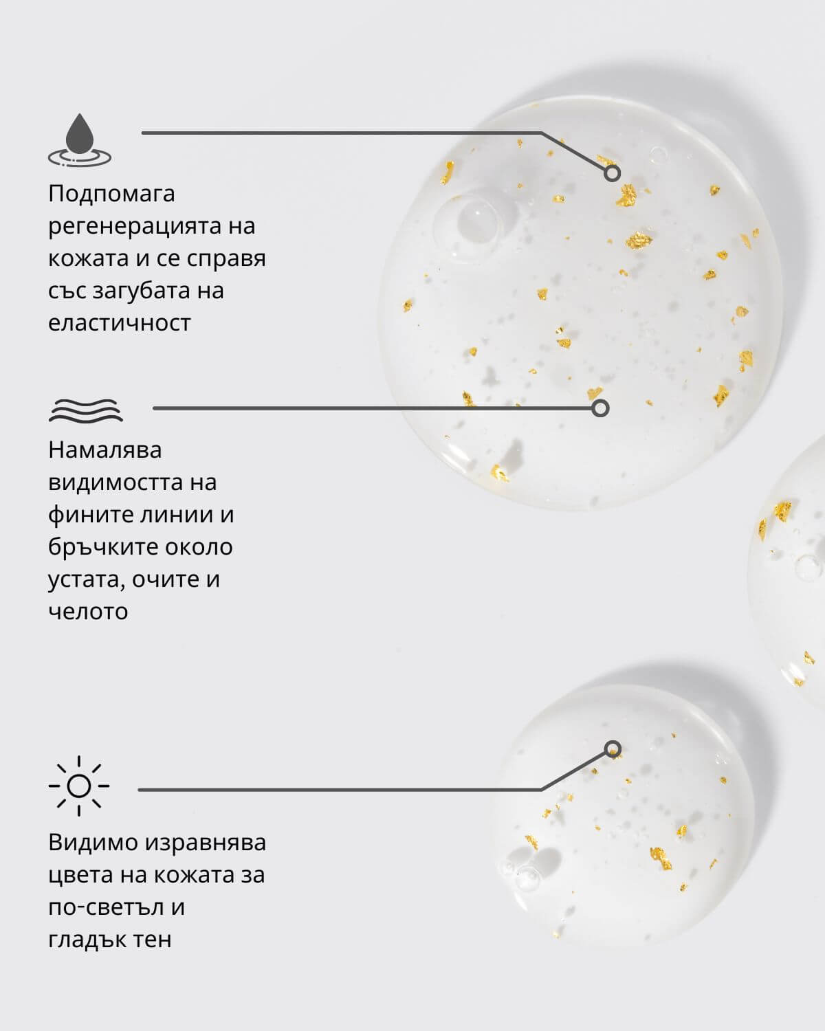 Той ефективно се справя с фините линии, озарява и хидратира в дълбочина, като оставя кожата ви със сияен блясък. Нашата уникална смес, включваща 24-каратово злато, ниацинамид и хиалуронова киселина, укрепва хидратиращата бариера на кожата и подобрява цялостната ѝ структура.
